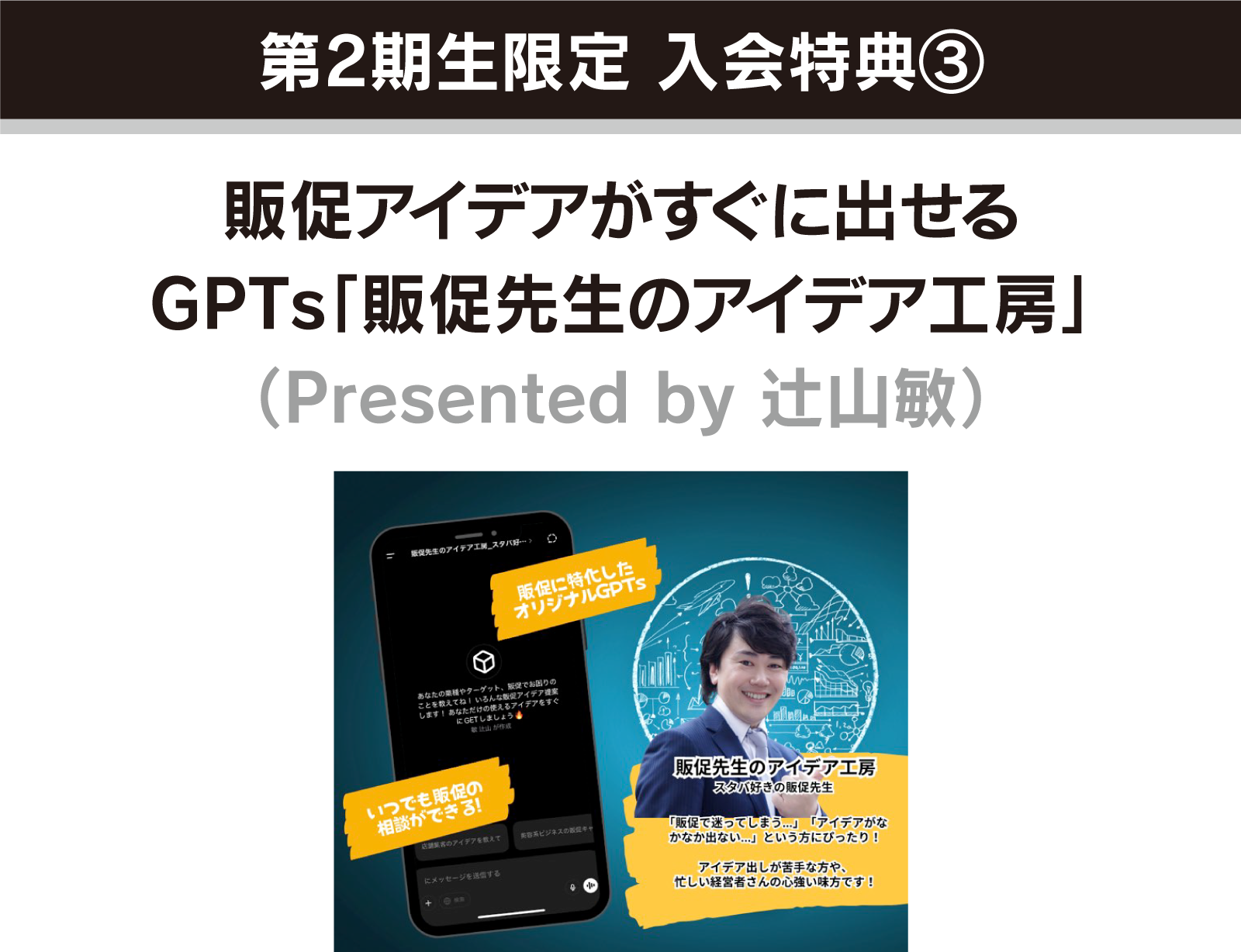 SNS投稿やチラシのキャッチコピー、イベント企画のネタ出しなど、販促に役立つアイデアをいつでもサポートしてくれる、あなただけのオリジナルGPTsです。