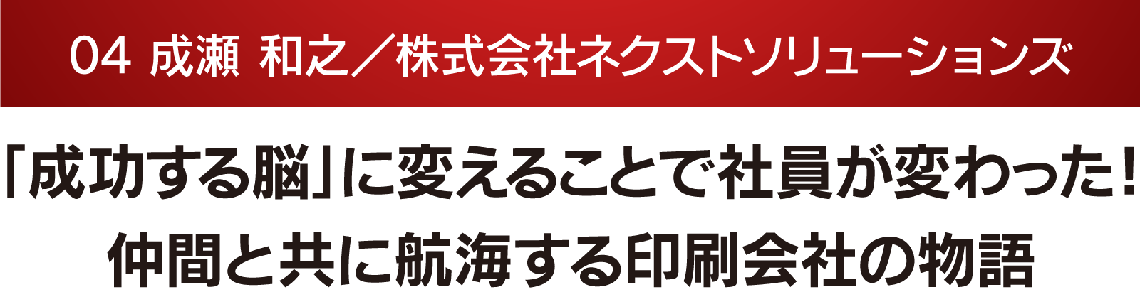 1996年、当時の有限会社成瀬印刷へ入社。2015年7月、代表取締役に就任。2021年6月、株式会社ネクストソリューションズへ改名。経営理念「人々の喜ぶ姿を見る事が私たちの原動力」を土台に活動中。