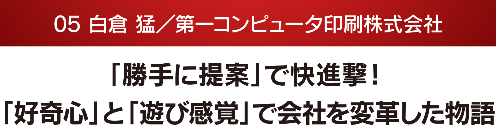 「値段なんていくらでも払うから、いいものを作ってきてくれ!」クライアントからのこの言葉で目覚めた白倉氏は、頼まれてもいない課題解決のツールや印刷物を勝手に作ってお客様に提案する「勝手に提案サービス」で会社の売上げアップと社員を成長させることの2つを一気に実現しました。