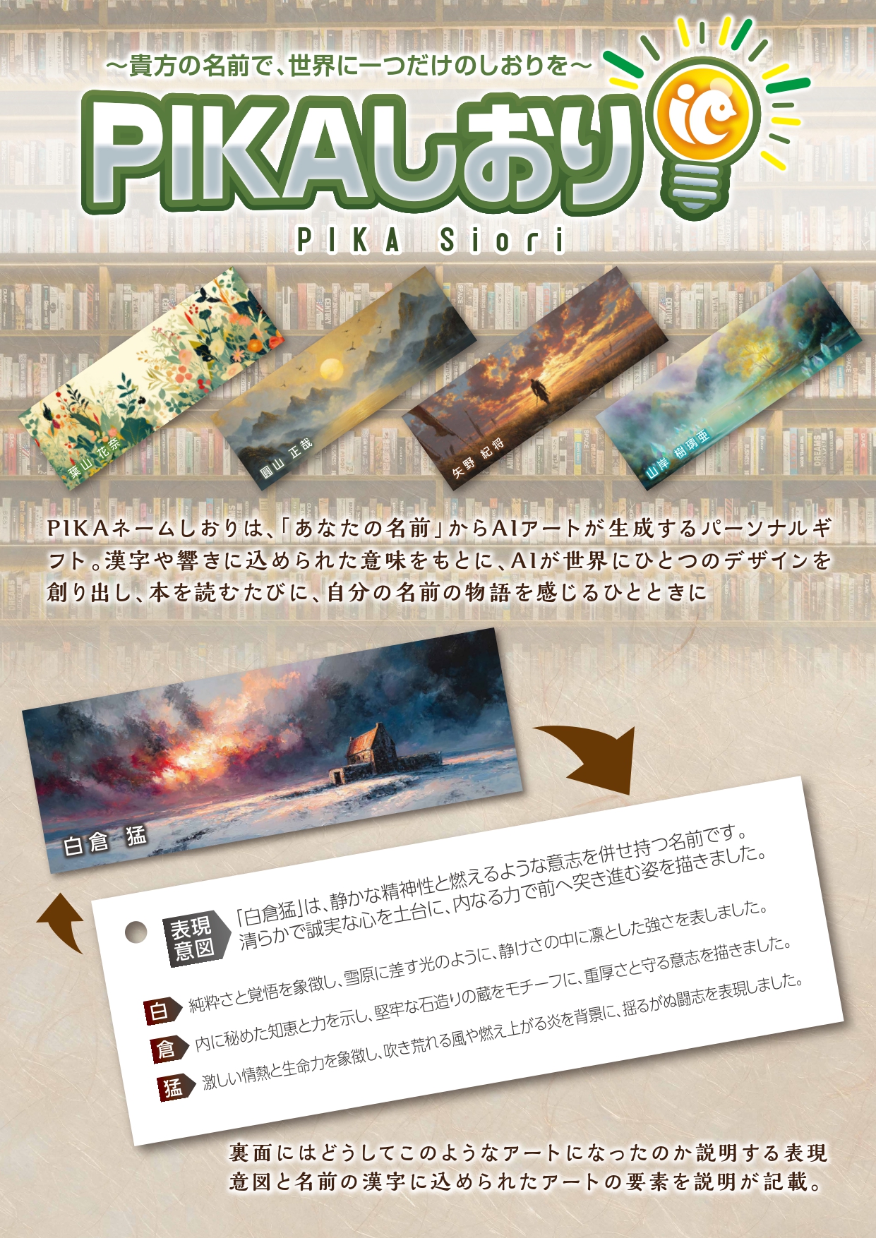 「PIKAネーム(しおり版)」とは、あなたの名前からAIアートが生成するパーソナルギフトです。名前の漢字や響きに込められた意味をもとにAIアートがひとつのデザインを創り出します。